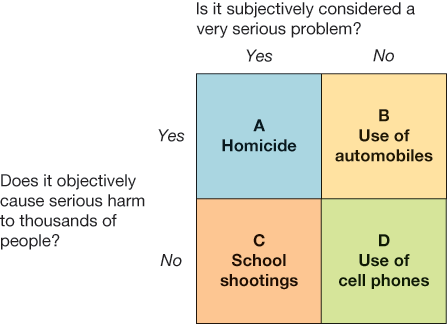 Essentially what this figure does is to show how some social problems are perceived, in terms of being subjectively and objectively harmful. It also shows that although some problems can be objectively harmful, they may not necessarily be perceived as social problems. This is not saying that problems in one box cannot change to another box. In fact, one of my main points is the fact that they do change.
